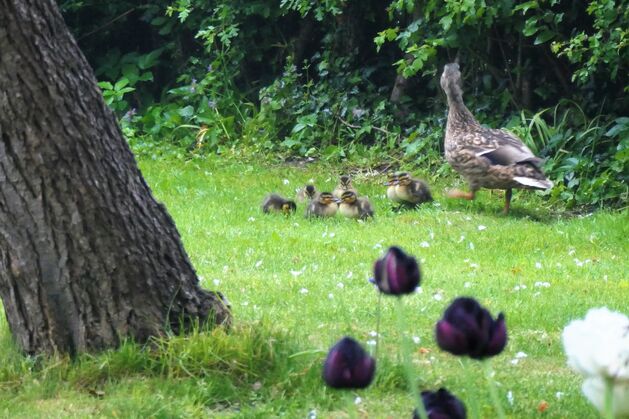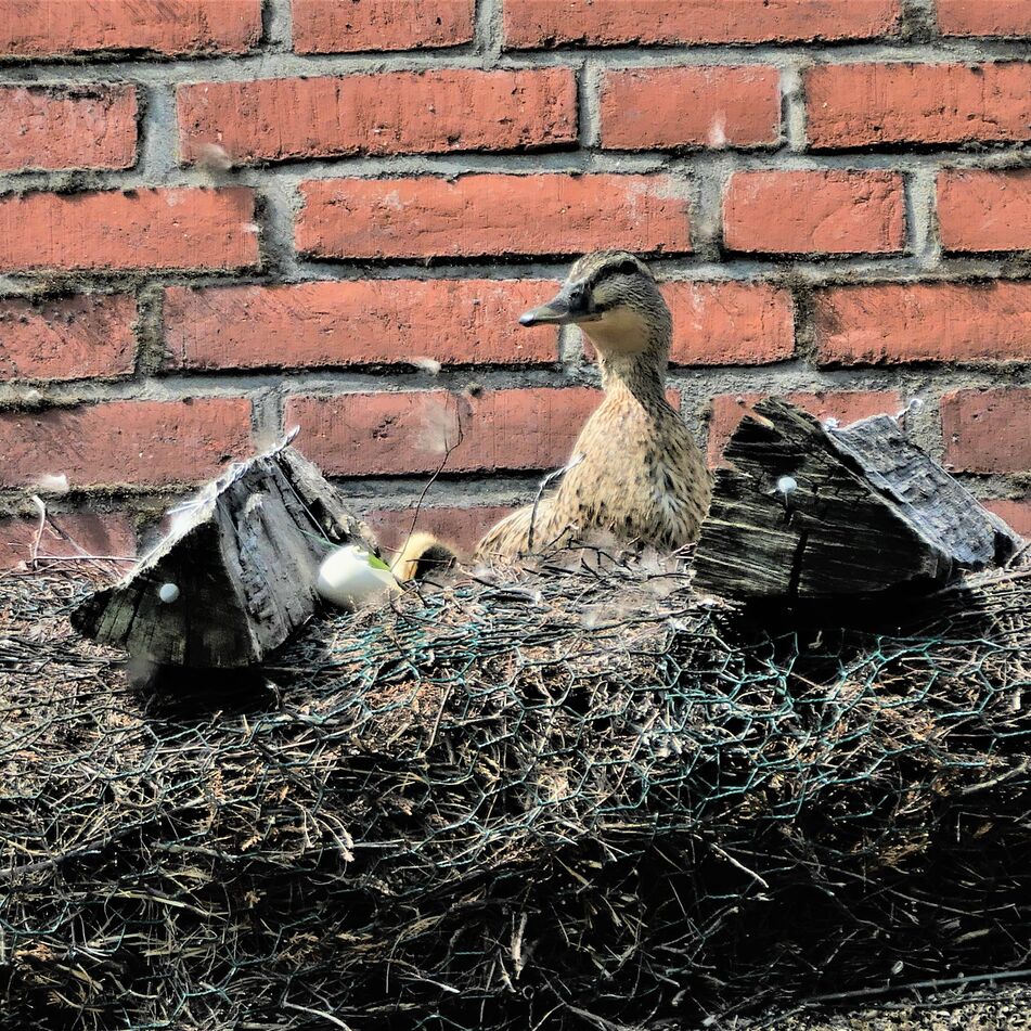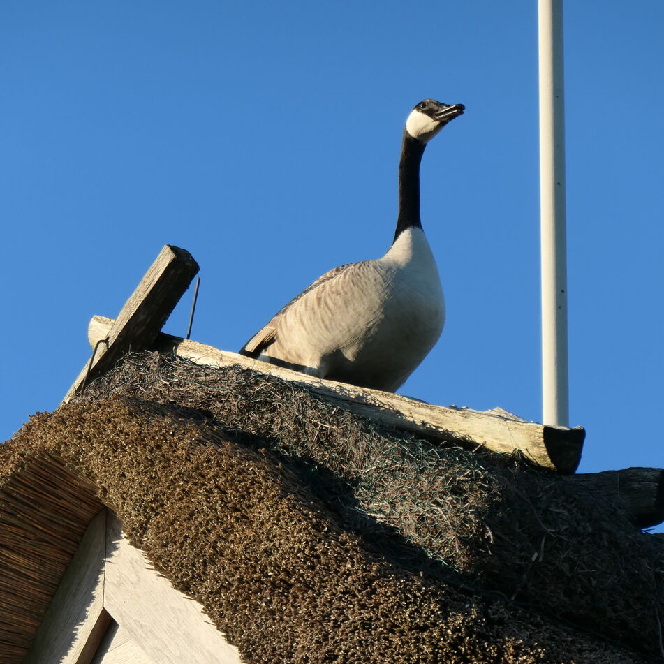 Stockenten und Graugänse lieben es an der Südseite unseres Schornsteins ihr Nest zu bauen. Das Plätzchen ist unter Enten und Gänsen sehr begehrt und so gibt es darum manchmal flügelschlagende Auseinandersetzung. Sie legen hier im frühen Frühjahr ihre Eier und brüten diese über mehrere Wochen aus. So sitzten sie bei Wind und Wetter, Sturm und Regen, Sonnenschein und Schnee auf ihren Eiern, bis alle an einem Tag schlüpfen und die Mutter das Dach verlässt, sodas die Küken ihr folgen indem sie vom Dach herunterkullern.