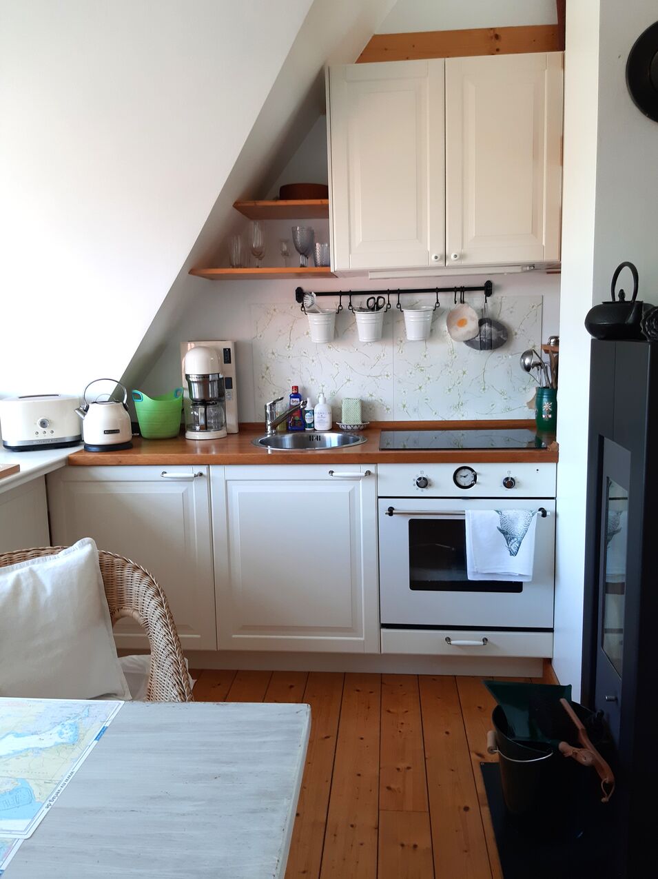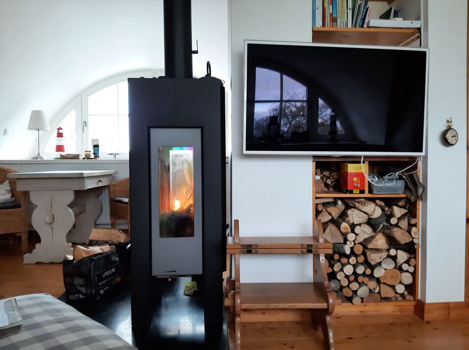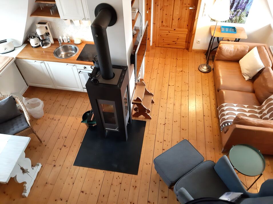 - Die FERIENWOHNUNG ist für 2 Personen, liegt im Obergeschoss mit ca. 40 qm direkt unterm Riet. Sie ist lichtdurchflutet durch Fenster die in alle vier Himmelsrichtungen blicken lassen. Der Wohnraum mit Pantyküche, Kaminofen, Eß,- und Sitzecke. Ein kleines Bad mit WC und Dusche, und eienem gemütlichen Schlafzimmer.