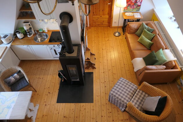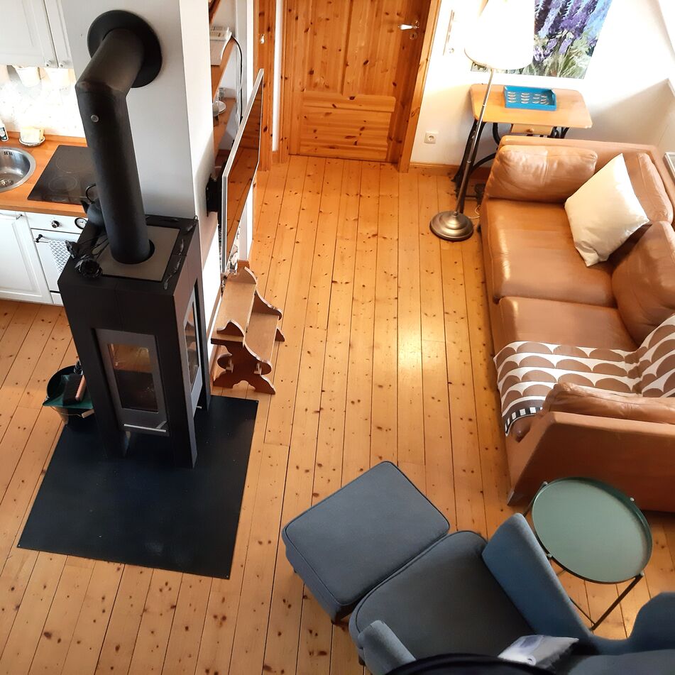 - Sie ist lichtdurchflutet durch Fenster die in alle vier Himmelsrichtungen blicken lassen. Der Wohnraum mit Pantyküche, Kaminofen, Eß,- und Sitzecke.